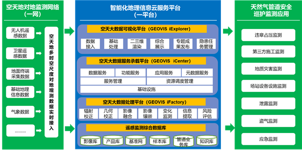 管道空天地一體化智能巡檢系統是構建“一網(wǎng)、一平臺”的遙感信息服務(wù)模式,實(shí)時(shí)接入空、天、地融合的多時(shí)空尺度觀(guān)測數據,以智能化地理信息云服務(wù)平臺為核心,形成面向線(xiàn)路安全巡檢的應用系統。系統架構如圖 1所示。