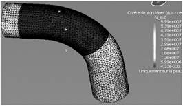 經(jīng)有關(guān)部門(mén)研究, 采用凱夫拉纖維復合材料補強技術(shù)對此段管道進(jìn)行修復。 補強方案確立后, 經(jīng)過(guò)耐斯管道公司軟件分析, 計算管道缺陷的相關(guān)數據信息, 確定了補強修復的產(chǎn)品類(lèi)型和方式。 首先對無(wú)缺陷管道承受內壓時(shí)管壁應力分布進(jìn)行計算。 在管道完好無(wú)損情況下, 承受11MPa的內壓時(shí), 建立3D模型對該方案進(jìn)行分析。 在3D模型中, 鋼材的彈性模量取207GPa, 泊松比為0.3, 屈服強度為450MPa。 管道內的運行壓力設定為11MPa, 凱夫拉纖維復合材料補強層數為26層。