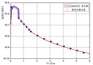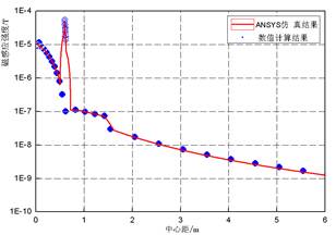 為從數學(xué)角度描述極低頻磁信號的傳播機理,需要建立移動(dòng)極低頻磁信號源的麥克斯韋時(shí)諧電磁場(chǎng)傳播方程[2]。帶入邊界條件,進(jìn)一步推導出管道不同區域的磁感應強度的積分表達式。通過(guò)數值解法,可以得到極低頻磁信號源從管道內部軸線(xiàn)向管道外傳播過(guò)程中磁感應強度隨距離的衰減特性。