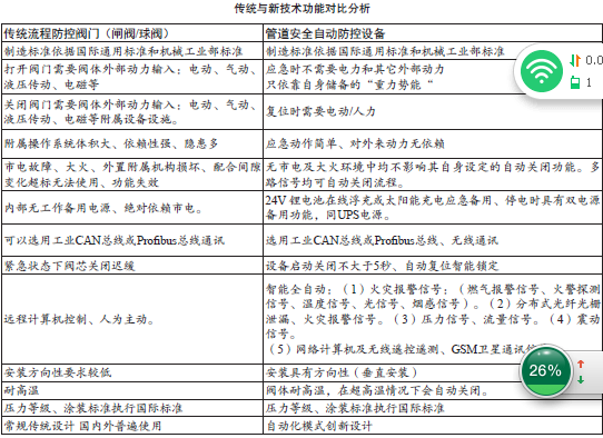 “管道安全自動(dòng)防控設備”自動(dòng)化程度高、使用重力作為設備應急動(dòng)力,保持穩定安全可靠、啟閉迅速。設備所屬電器遵守本安式、隔爆式設計為防爆產(chǎn)品。部件選擇不同材質(zhì),可適用各種介質(zhì)。兼容接收各種警報信號指令、全自動(dòng)響應迅速、調控準確到位。不依賴(lài)市電、液壓、氣源、蓄能器等能源!肮艿腊踩詣(dòng)防控設備”技術(shù)特性見(jiàn)下表。
