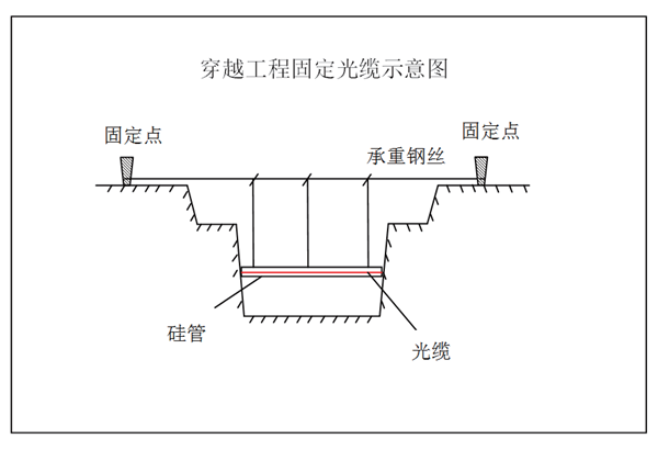 交叉工程施工是威脅光纜安全的重要因素, 穿越工程由于施工過(guò)程需將光纜懸空,風(fēng)險最高。施工前應采用人工開(kāi)挖精確定位光纜位置,待光纜懸空后套硅管進(jìn)行保護,并在穿越段溝坡上方設置固定點(diǎn)綁扎承重鋼絲做支撐,再將光纜懸吊在承重鋼絲上。這樣做的目的是減輕光纜自身重力影響及緩沖重物掉落光纜所受應力。光纜距離管道較近時(shí),可將光纜直接固定在管道上更安全。