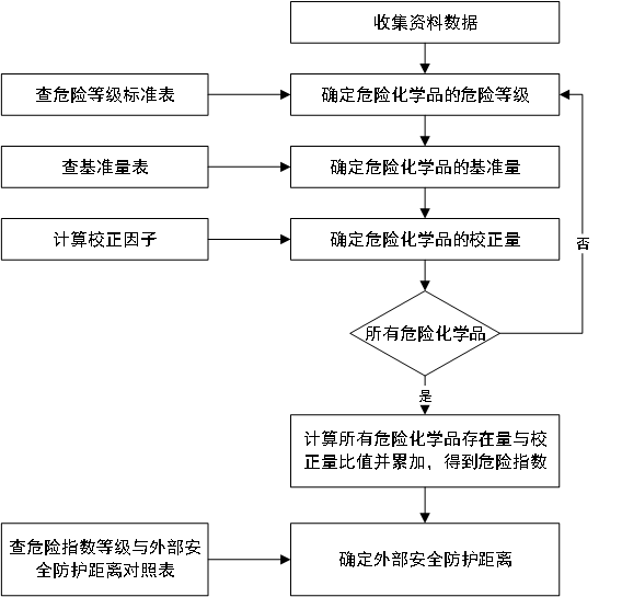 根據危險化學(xué)品的數量、性質(zhì)、位置和生產(chǎn)類(lèi)型,評估和計算危險化學(xué)品生產(chǎn)、儲存裝置的危險指數,并確定外部安全防護距離的方法。