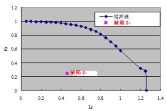 按照前述參數,在10MPa設計壓力下,評價(jià)結果顯示,缺陷1距臨界線(xiàn)較遠,缺陷可接受,如圖1所示。