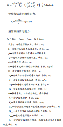 清管器在管道中運行時(shí),輸送成品油會(huì )在清管器前后產(chǎn)生壓差,壓差作用在清管器后端對清管器產(chǎn)生推力,管壁對清管器的摩擦阻力和管壁凝結油泥的剪切力及清管器前端污物產(chǎn)生的阻力。清管器只有當油流的推動(dòng)力大于管壁摩擦阻力、管壁凝結油泥的剪切力和被清理的油泥及污物的阻力的合力時(shí),清管器運行時(shí),重力在沿管道軸向的分力與油流方向一致時(shí)提供動(dòng)力,反之提供阻力,清管器才能順利通過(guò)管道。根據受力情況,機械清管器運行時(shí)存在如下關(guān)系式: