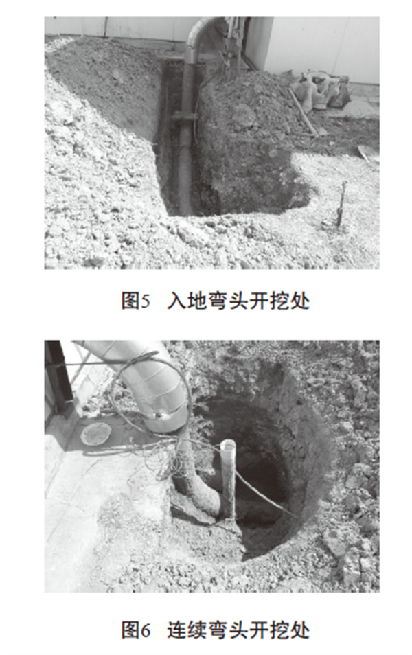 進(jìn)站彎頭處壁厚9.2mm, 內徑為254.6mm;出站彎頭壁厚9.9mm,內徑為253.2mm。三個(gè)彎頭為連續彎頭(見(jiàn)圖5、圖6),其中兩個(gè)彎頭的直管段部分只有1m,檢測器通過(guò)能力較弱,此位置容易卡堵。