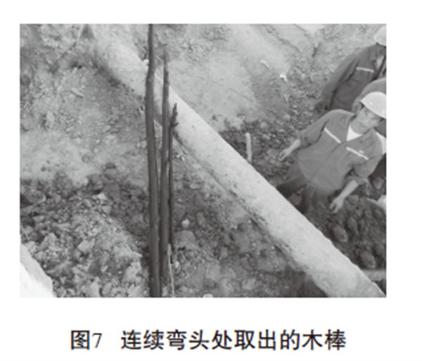 (4)704、706成品油站的閥門(mén)連續三個(gè)彎頭造成清管器通過(guò)能力減弱問(wèn)題,實(shí)施了工藝改造,由三個(gè)連續彎頭連接改為直管連接的方式。改造中發(fā)現,在連續彎頭處有三根木棒(見(jiàn)圖7),最長(cháng)的3米,最短的也有1 米。
