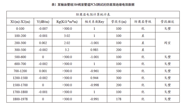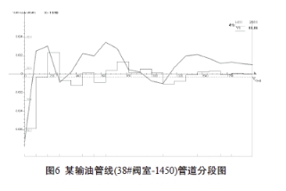 如,西部管道某轄管段5#監測點(diǎn)(手動(dòng)閥室)和42#分輸閥室就是因為接地漏電,導致線(xiàn)路保護距離大幅縮短。在排查閥室管道的絕緣性能時(shí),可以通過(guò)測試防腐層的絕緣電阻進(jìn)行直觀(guān)判斷。如某輸油管線(xiàn)38#閥室(其管道分段圖如圖6所示),通過(guò)PCM測試的電阻值(見(jiàn)表1)可以明顯看出閥室部位管道的絕緣性能很差。