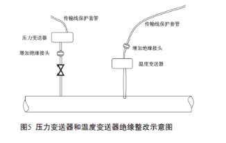 由于這些部位絕緣設計的缺失,造成陰極保護電流的漏泄,影響了該段管道的陰極保護效果。通過(guò)在這些部位增加絕緣法蘭設置,使管道的電絕緣狀況得到改善。例如:在壓力變送器針形閥上端增加絕緣接頭使其與接地網(wǎng)完全隔離; 在溫度變送器傳輸線(xiàn)保護套管處增加絕緣接頭, 同時(shí)斷開(kāi)溫度變送器殼;對壓力變送器和溫度變送器增設了絕緣接頭。如圖5所示。