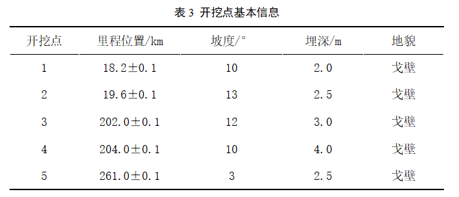 參考NACE 0208-2008對于開(kāi)挖點(diǎn)選擇的推薦作法,在每個(gè)LP-ICDA區間內應對前2處最大優(yōu)先級別的位置進(jìn)行詳細檢查。因此,在評估區域一和區域二分別選擇前2處內腐蝕概率最高的位置,并且在區域二另選1處腐蝕概率較高的位置作為驗證。結合高程數據,考慮開(kāi)挖可行性及現場(chǎng)勘查結果,5個(gè)開(kāi)挖點(diǎn)的坡度、埋深和地貌情況見(jiàn)表3。