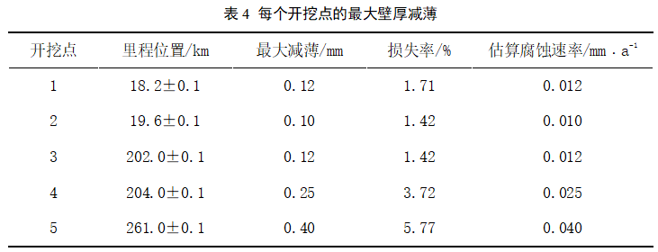 開(kāi)挖后,使用超聲波測厚儀對管道進(jìn)行壁厚檢測,現場(chǎng)開(kāi)挖檢測(見(jiàn)圖6)。根據壁厚檢測結果,得知5個(gè)開(kāi)挖位置的實(shí)際測量壁厚都大于額定壁厚的90%( 見(jiàn)表4)。因此,可以初步判斷沒(méi)有顯著(zhù)內腐蝕缺陷。根據估算的腐蝕速率,判斷5個(gè)開(kāi)挖點(diǎn)的腐蝕狀況屬于NACE SP0775-2013標準中規定的輕度腐蝕,腐蝕風(fēng)險較低。