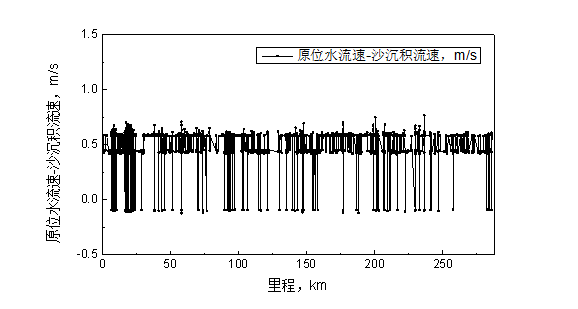 將沉積床流速與原位水流速進(jìn)行對比,當原位水膜速度大于沙沉積速率時(shí),如果目標管道中存在沙,則會(huì )沿管道移動(dòng),否則將會(huì )沉積在管道底部。該管段原位水流速-沙沉積流速沿里程分布如圖5所示,其中差值小于0的位置,沙可能沉積在管道底部,即固體積聚風(fēng)險位置。
