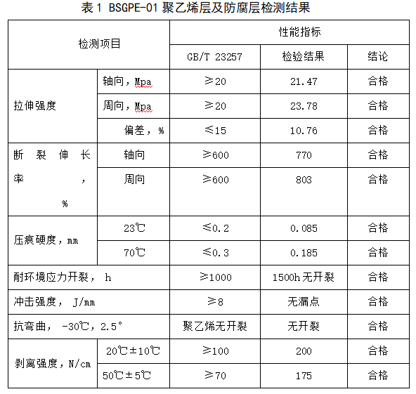 2012年以前,中石油還沒(méi)有自主品牌的聚乙烯防腐專(zhuān)用料投放市場(chǎng),寶雞石油鋼管公司高峰時(shí)期每年需要從市場(chǎng)上采購聚乙烯防腐料近3萬(wàn)噸。2011~2014年,西南化工銷(xiāo)售分公司、獨山子石化分公司和寶雞石油鋼管有限責任公司三家產(chǎn)銷(xiāo)研單位聯(lián)合成立項目組,整合和利用自身的煉化資源和研發(fā)優(yōu)勢,開(kāi)發(fā)了自主品牌的“埋地鋼質(zhì)道聚乙烯防腐專(zhuān)用料BSGPE-01”,并通過(guò)了專(zhuān)家鑒定,性能達到國內領(lǐng)先水平,質(zhì)量檢測結果見(jiàn)表1。