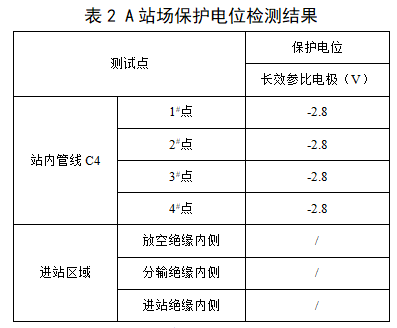 由表1可見(jiàn),恒電位儀的參比電位偏負。為同時(shí)現場(chǎng)進(jìn)行了開(kāi)箱檢測,以了解埋地管道的保護電位,結果見(jiàn)表2。