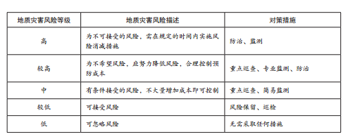 參考中國石油提出的地質(zhì)災害風(fēng)險分級原則,在綜合考慮地質(zhì)災害危險性、危害性、工程防治成本等因素情況下,油氣管道地質(zhì)安全評價(jià)的風(fēng)險等級及對策措施可參考下表進(jìn)行選擇: