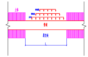 根據上述建模方式建立中間具有懸空長(cháng)度L的計算模型,施加工作壓力、土壓力、管道自重和油自重等外部荷載,計算懸空長(cháng)度L下管道的應力,計算模型如圖2所示。