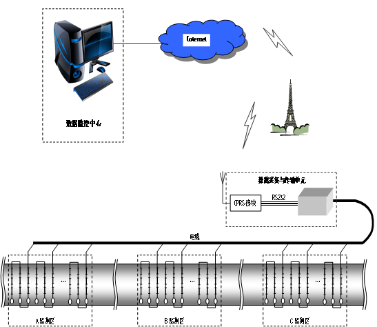 聯(lián)合監測方法包括管道當前應力檢測、管道實(shí)時(shí)應力監測和黃土滑坡地表變形監測三個(gè)方面。根據聯(lián)合監測方法,開(kāi)發(fā)了監測系統,由管體應變監測傳感器、數據采集與傳輸單元、供電單元、數據處理中心等四部分組成,如圖1所示。管道當前應力檢測和黃土滑坡地表變形監測采用人工現場(chǎng)采集數據的方式,監測系統主要用于監測管道實(shí)時(shí)應力。用現場(chǎng)監測傳感器測量采集管體應變數據,采集頻率和采集時(shí)間由數據采集和傳輸單元控制,數據采集和傳輸單元接收到數據后,將數據保存并通過(guò)GPRS網(wǎng)絡(luò )進(jìn)行遠程傳輸,數據處理中心接收到數據后進(jìn)行分析處理。數據采集和傳輸單元采用太陽(yáng)能+蓄電池供電方式。