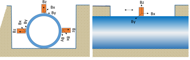 根據檢測設備功能,對每個(gè)管道檢測截面沿環(huán)向均勻分配了三條檢測線(xiàn)路,分別是內側(靠近山體面)、上側(管道上側水平面)及外側(遠離山體面)。采用三維磁力檢測儀采集這三條檢測線(xiàn)路上軸向、環(huán)向及徑向的磁記憶信號,如圖3所示。