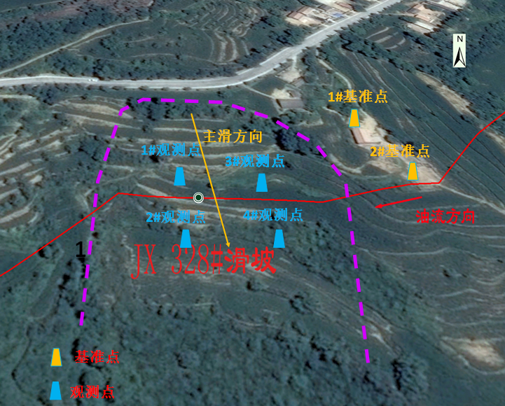 根據上文提到的基準點(diǎn)和觀(guān)測點(diǎn)設置原則,將滑坡的基準點(diǎn)選擇在滑坡體外部穩定的區域。在滑坡主滑方向和滑坡斷面設置測點(diǎn),主滑方向設置2個(gè)觀(guān)測點(diǎn),滑坡斷面設置2個(gè)觀(guān)測點(diǎn),共計4處觀(guān)測點(diǎn),如圖5所示。