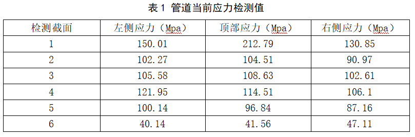 根據管道油流方向,將6個(gè)檢測截面按照順序標記,并將測點(diǎn)按照油流方向分為左側測點(diǎn)、頂部測點(diǎn)和右側測點(diǎn),各點(diǎn)的應力值如表1所示。