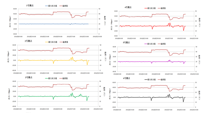 (2)1~6監測截面的數據趨勢十分相近,與溫度曲線(xiàn)對比,發(fā)現應力隨著(zhù)溫度的變化而反向變化,應力的變化主要是由溫度引起的。