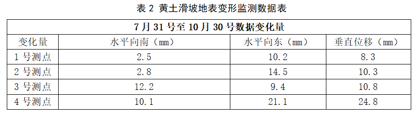 (2)根據測點(diǎn)的觀(guān)測數據,滑坡的滑動(dòng)量在2cm范圍內,滑坡處于低速變形狀態(tài)。