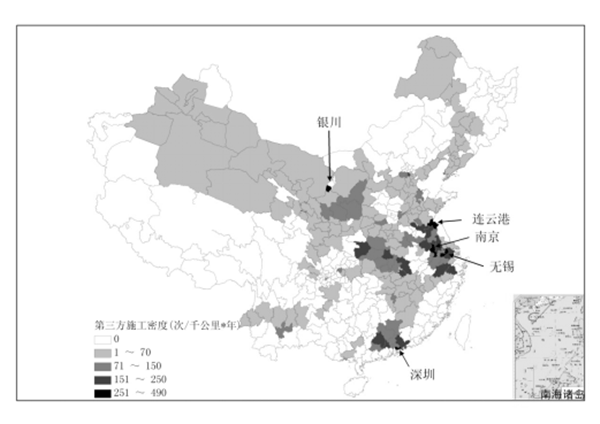 以管道第三方施工為例,選取2011 -2014年第三方施工記錄,采用基于GIS技術(shù)的空間分布分析模型,得出第三方施工的空間密度圖(如圖 1所示)[2]。根據分析結果,得出管道第三方施工的空間分布特性如下:管道附近第三方施工發(fā)生頻次最高的地區主要分布在銀川市、深圳市、連云港市、南京及無(wú)錫市,發(fā)生頻次范圍為251-490次/103 km﹒a(見(jiàn)圖1中箭頭所指深色區域);管道附近第三方施工發(fā)生頻次較高地區主要分布在湖北、江蘇、安徽、浙江、廣東省部分地市,發(fā)生頻次范圍為151-250次/103 km﹒a;除此之外,其他區域的管道第三方施工發(fā)生頻次范圍分別為71-150次/103 km﹒a、1-70次/103 km﹒a,以及無(wú)管道第三方施工發(fā)生。