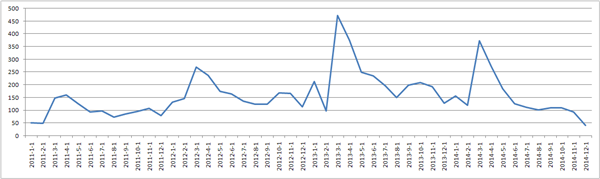 將管道第三方施工數據以月為單位統計,得到每月的第三方施工數據統計圖(如圖3所示)。其中,橫軸為年度及月份,縱軸為發(fā)生的數量。從圖中可以看到每年的3月份均為管道第三方施工的高發(fā)期。