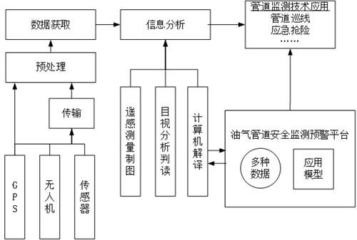 管道無(wú)人機監測系統由三個(gè)基本環(huán)節組成:無(wú)人機遙感數據獲取、遙感信息分析和管道監測技術(shù)應用(圖1)。無(wú)人機、遙感器(數碼相機、高清攝像機、雙光吊艙等)、GPS、數據傳輸及預處理系統構成了無(wú)人機遙感數據獲取系統。將遙感數據進(jìn)行測量制圖、目視判讀以及計算機解譯可以得到地物時(shí)空信息。在地理信息系統平臺(油氣管道安全監測預警平臺)的支持下,將提取出的時(shí)空信息與其他多種信息結合起來(lái),有效完成相關(guān)應用任務(wù),實(shí)現管道監測系統的技術(shù)應用。
