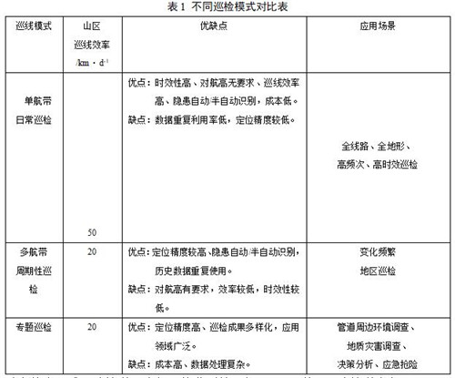 無(wú)人機管道巡線(xiàn)主要用于河流穿跨越、沼澤、沙漠、山嶺、森林、高后果區等復雜區域巡線(xiàn),彌補人工巡線(xiàn)的不足,可分為單航帶日常巡線(xiàn)、多航帶周期性巡線(xiàn)和專(zhuān)題巡線(xiàn)三種巡檢模式,其對比見(jiàn)表1。
