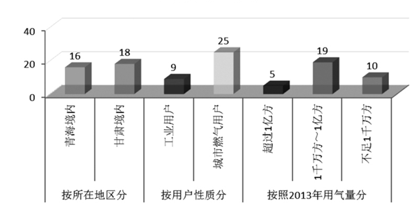 澀寧蘭管道沿線(xiàn)現有用戶(hù)34家,分輸口共計41處。按所在地區分:青海境內16家,甘肅境內18家。按用戶(hù)性質(zhì)分:工業(yè)用戶(hù)9家,城市燃氣用戶(hù)25家。按照2013年用氣量分:超過(guò)1億方的5 家,1千萬(wàn)方~1億方的19家,不足1千萬(wàn)方的10 家。