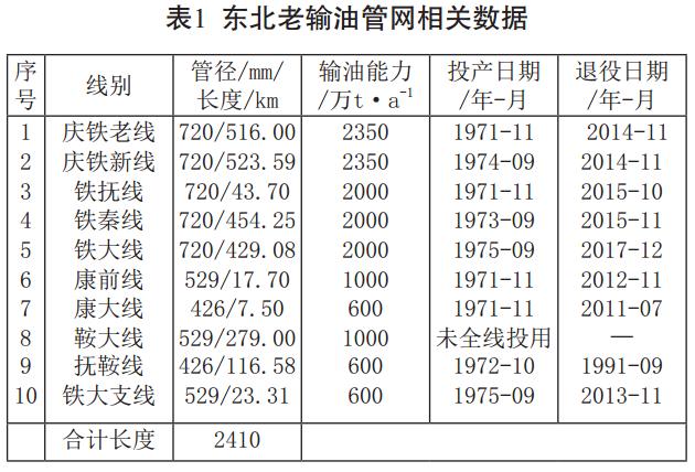 東北老輸油管網(wǎng)是指從1970年8月3日開(kāi)始陸續建成的大慶至鐵嶺老線(xiàn)(以下簡(jiǎn)稱(chēng)慶鐵老線(xiàn))及鐵撫線(xiàn)、慶鐵新線(xiàn)、鐵秦線(xiàn)、鐵大線(xiàn)等10條主干線(xiàn)和支線(xiàn),其中9條管線(xiàn)在1975年前建成,形成了全國首個(gè)大規模、高輸量的輸油管網(wǎng)。各條管線(xiàn)的管徑、長(cháng)度和建設時(shí)間等見(jiàn)表 1。