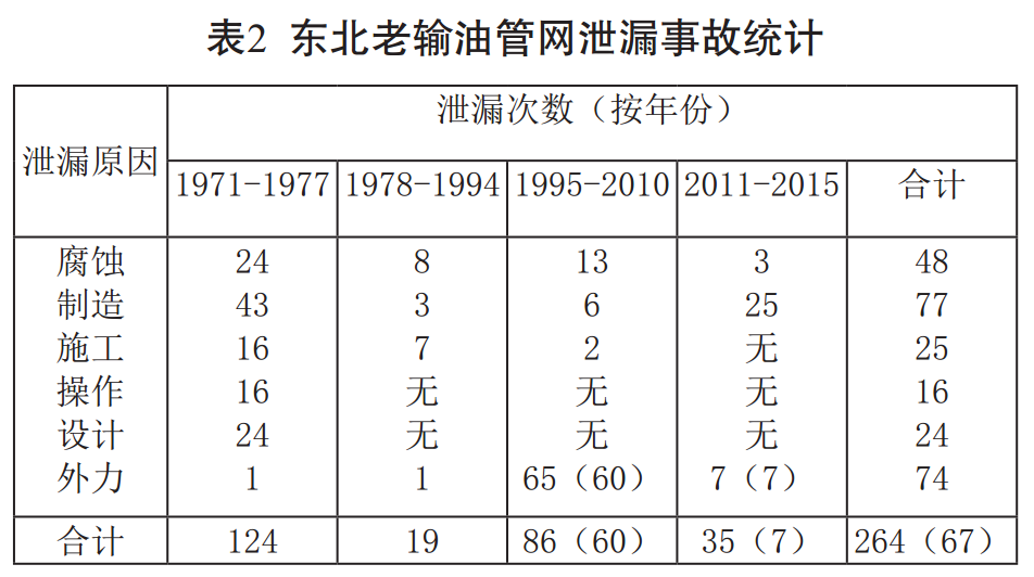 東北老輸油管網(wǎng)的幾大主干線(xiàn)隨著(zhù)新管線(xiàn)的相繼建成分別于2014、2015、2016年梯次退役,服役年限定格在41~45年,老管網(wǎng)的整體使用壽命可以確定為45年。本文將以老管網(wǎng)所發(fā)生的泄漏事件為主線(xiàn),解析我國第一個(gè)大口徑、長(cháng)距離輸油管網(wǎng)的生命歷程。
