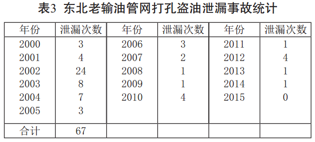 以管道運行期所發(fā)生的全部泄漏事故數據為依據,繪制東北老輸油管網(wǎng)生命曲線(xiàn)圖(見(jiàn)圖 1)。圖中的曲線(xiàn)1999~2015年之間增加了虛線(xiàn)部分,虛線(xiàn)部分包含了因打孔盜油而發(fā)生泄漏的數據曲線(xiàn),可以看到,在虛線(xiàn)部分出現了一個(gè)突起的尖峰,其原因是從2000年起出現了一個(gè)來(lái)自社會(huì )的外力干擾——打孔盜油。據統計,2000~2015年,打孔盜油引發(fā)的泄漏事故達67起,占事故總數的25.38%。打孔盜油引發(fā)的泄漏事故年度分布見(jiàn)表 3。