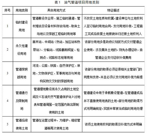 1  油氣管道項目用地的種類(lèi)和特點(diǎn)