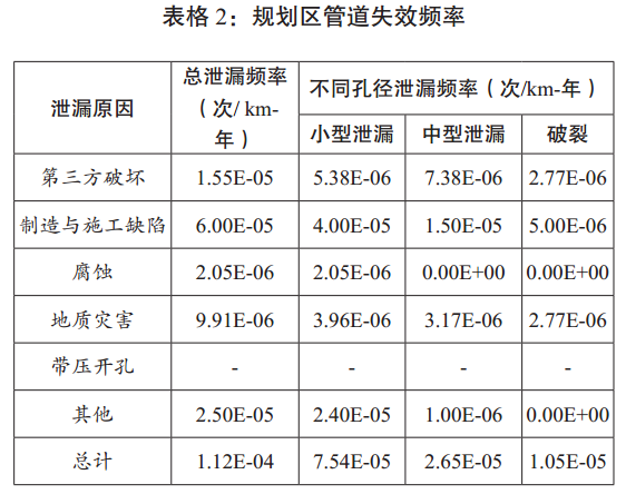 在基于EGIG事故統計數據的基礎上,結合管道的具體設計參數,確定了管道不同泄漏孔徑的泄漏頻率,如表格2所示。