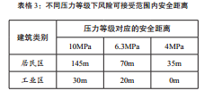 從圖中可以看出,隨著(zhù)設計壓力等級降低,人員死亡風(fēng)險明顯減小,依據風(fēng)險可接受標準,不同設計壓力下風(fēng)險可接受范圍內的安全距離如表格3所示。