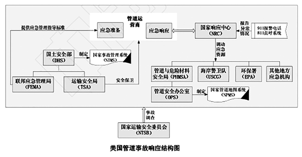 其中,聯(lián)邦法規要求各州建立直呼系統(one-call),并向國家響應中心(NRC)上報各類(lèi)管道及其周邊異常事件;管道安全辦公室(OPS)建立了國家地理系統(NPMS),為管道監管、應急處置等提供決策支持;管道運營(yíng)商定期向管道安全辦公室(OPS)上報管道安全運行狀況,并接受其安全監督。