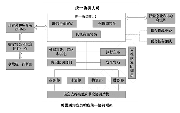 美國的應急救援法律法規及標準等體系比較成熟,從應急救援文件的制定,到應急設備和能力的準備,以及應急救援的實(shí)際操作都制定了相應的法規和標準。例如,美國國土安全部(DHS)于2004年3月制定《國家事故管理系統》(NIMS),明確美國各級部門(mén)應急職責和框架(下圖),為美國聯(lián)邦、州和地方各級政府部門(mén)有效管理事故提供了一個(gè)模板,建立了統一制定和更新國家應急救援國家標準、導則和協(xié)議等制度。