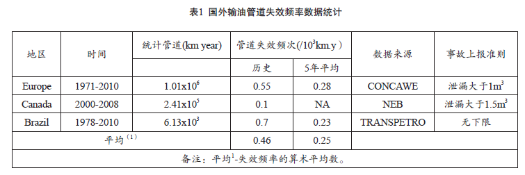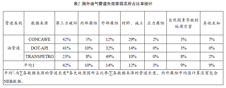 造成輸油管道事故的原因主要有第三方破壞、腐蝕、材料和施工、管道應力腐蝕、自然原因造成的地質(zhì)災害和其他未知因素。根據國外統計數據,輸油管道平均失效頻次約為0.46×10-4 次/(km•),根據管道的失效原因和失效頻次,對不同數據來(lái)源的管道失效原因所占頻次進(jìn)行統計, 顯見(jiàn)第三方破壞和管道內外腐蝕為主要因素。