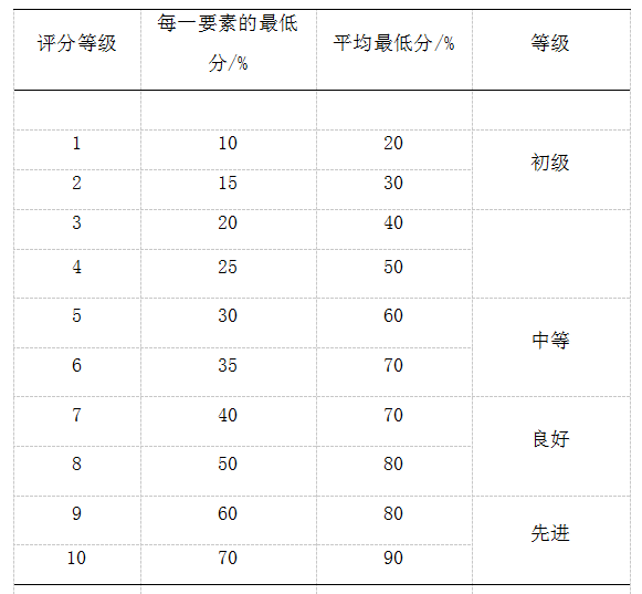 為了更加清晰地掌握企業(yè)完整性管理實(shí)施狀態(tài),直觀(guān)了解完整性管理水平所處的等級,明確完整性管理努力的方向,根據調查體系中各要素的平均得分率以及各子程序最低得分率情況,將完整性管理水平分為初級、中等、良好、先進(jìn)四個(gè)大范圍等級,這四個(gè)等級又可以細分出10個(gè)小范圍等級,如表2所示。