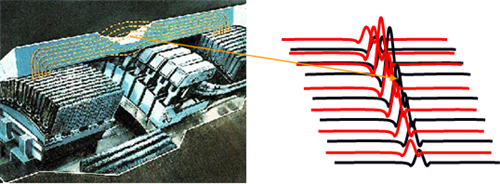 檢測器在管內運行時(shí),利用其上安裝的永久性磁鐵將管道管壁飽和磁化,當管壁存在缺陷時(shí),磁力線(xiàn)會(huì )穿出管壁產(chǎn)生漏磁。主探頭拾取金屬損失處的漏磁信號,ID/OD探頭能夠區分管道內壁和外壁金屬損失缺陷。里程輪系統實(shí)時(shí)記錄管道里程信息。地面標記系統記錄檢測器通過(guò)設標點(diǎn)上方的準確時(shí)間,結合所采集的管道里程信息精確確定管道缺陷所在管道的里程位置,同時(shí)周向傳感器能夠確定缺陷所在管道的周向位置(圖 2、3、4)。