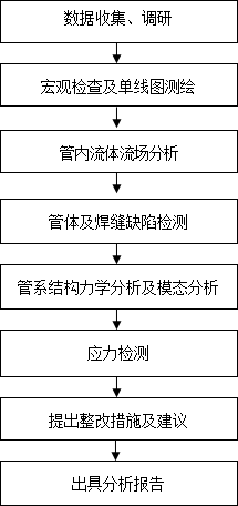 7)依據管道的受力情況,結合流場(chǎng)分析及應力理論分析結果,提出振動(dòng)減緩措施建議,同時(shí)綜合管道現場(chǎng)檢測評價(jià)結果及管道受力情況,最終確定管道的安全狀況,提出運行維護建議及措施。