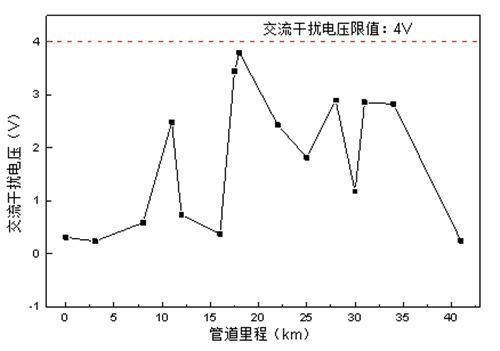 圖 3  緩解后管道沿線(xiàn)交流干擾分布