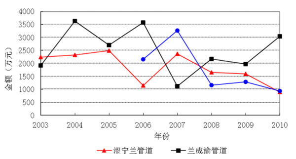 圖 4  澀寧蘭、蘭成渝、忠武管道地質(zhì)災害防治投資變化情況