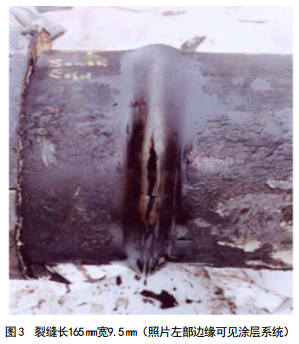 從事故管段切割了16 m長(cháng)管道,在NTSB的實(shí)驗室進(jìn)行了檢測。管道被壓彎,并在壓彎部位的內徑出現了一個(gè)向外突出的彎曲,形成的彎曲角度在5~6度之間。彎曲沿管道周?chē)由旒s270度,從10點(diǎn)鐘位置延伸到7點(diǎn)鐘位置(圖 2)。彎曲區域包括一個(gè)在彎曲頂部敞開(kāi)的裂縫,角度約從2點(diǎn)鐘位置延伸到4點(diǎn)鐘位置。彎曲的最大高度為25 mm,位于彎曲部?jì)葌,?點(diǎn)鐘位置。裂縫最寬部的長(cháng)度為165 mm,寬度為 9.5 mm(圖 3)。管道斷面在顯微鏡下進(jìn)行觀(guān)察,未發(fā)現外部腐蝕現象。