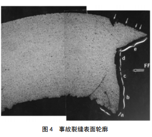 掃描電鏡檢查出5個(gè)明顯的裂縫區。圖 4給出了事故裂縫表面輪廓:(a)起始于管道的內表面,表明腐蝕疲勞所引起的裂紋;(b)(c)(d)分別表示裂縫輻射面從管道表面45度變?yōu)閹缀醮怪,表明拉應力和疲勞擴展,無(wú)明顯腐蝕;(e)表明裂紋擴展成為45度的剪切面。管道外表面鄰近的最終開(kāi)裂區呈蜂窩狀,主要是延性過(guò)應力裂紋。