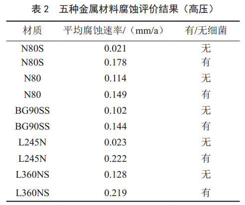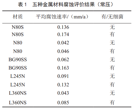 實(shí)驗研究了N80S、 N80、 BG90SS、 L245N、L360NS五種金屬材料在頁(yè)巖氣返排液無(wú)菌/有菌環(huán)境中及常壓/高壓條件下的腐蝕狀況,結果得出以下結論。