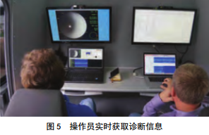 掃 描 探 傷 儀 的 內 置 式 鋰 — 鐵 聚 合 物 蓄 電 池(200 W/h容量)可提供長(cháng)達8 h的自給式操作電力(最高行駛速度空載模式下5 m/min,檢測模式下0.3~0.7 m/min)。操作員(距離插入掃描探傷儀的位置最遠為 1 500 m)通過(guò)Wi-Fi網(wǎng)絡(luò )實(shí)時(shí)控制掃描探傷儀移動(dòng),并實(shí)時(shí)獲取診斷信息,如圖 5所示。