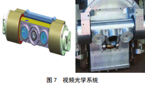 掃描探傷儀的視頻光學(xué)系統提供在線(xiàn)視覺(jué)檢測,提供5 m/min視頻外觀(guān)檢查數據。視頻光學(xué)系統包括一個(gè)500萬(wàn)像素矩陣的高清攝像頭和一個(gè)180°拾取角度的攝像鏡頭,兩個(gè)LED射燈和垂直平面模塊,可同時(shí)在掃描探傷時(shí)驅動(dòng)和啟動(dòng),如圖 7所示。其同時(shí)帶有兩個(gè)位于正面和背面的類(lèi)似的視頻光學(xué)系統單元,在小直徑管道(小于DN 500 mm)內,掃描探傷儀無(wú)法轉動(dòng),則需要第二臺攝像機相對掃描探傷儀反向移動(dòng)。該模塊還包括甲烷濃度測量傳感器和投射激光器。