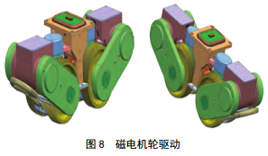 掃描探傷儀通過(guò)磁電機輪驅動(dòng)模塊沿任意路徑移動(dòng),磁模塊基于稀土永磁體,具有高殘留感應磁場(chǎng),鐵磁表面產(chǎn)生61.22 kg (600 N)的拉力,傳感器內置于模塊中,用于感應“輪面”輪廓的磁場(chǎng)強度,允許從鐵磁表面記錄車(chē)輪分離扭矩,如圖 8所示。